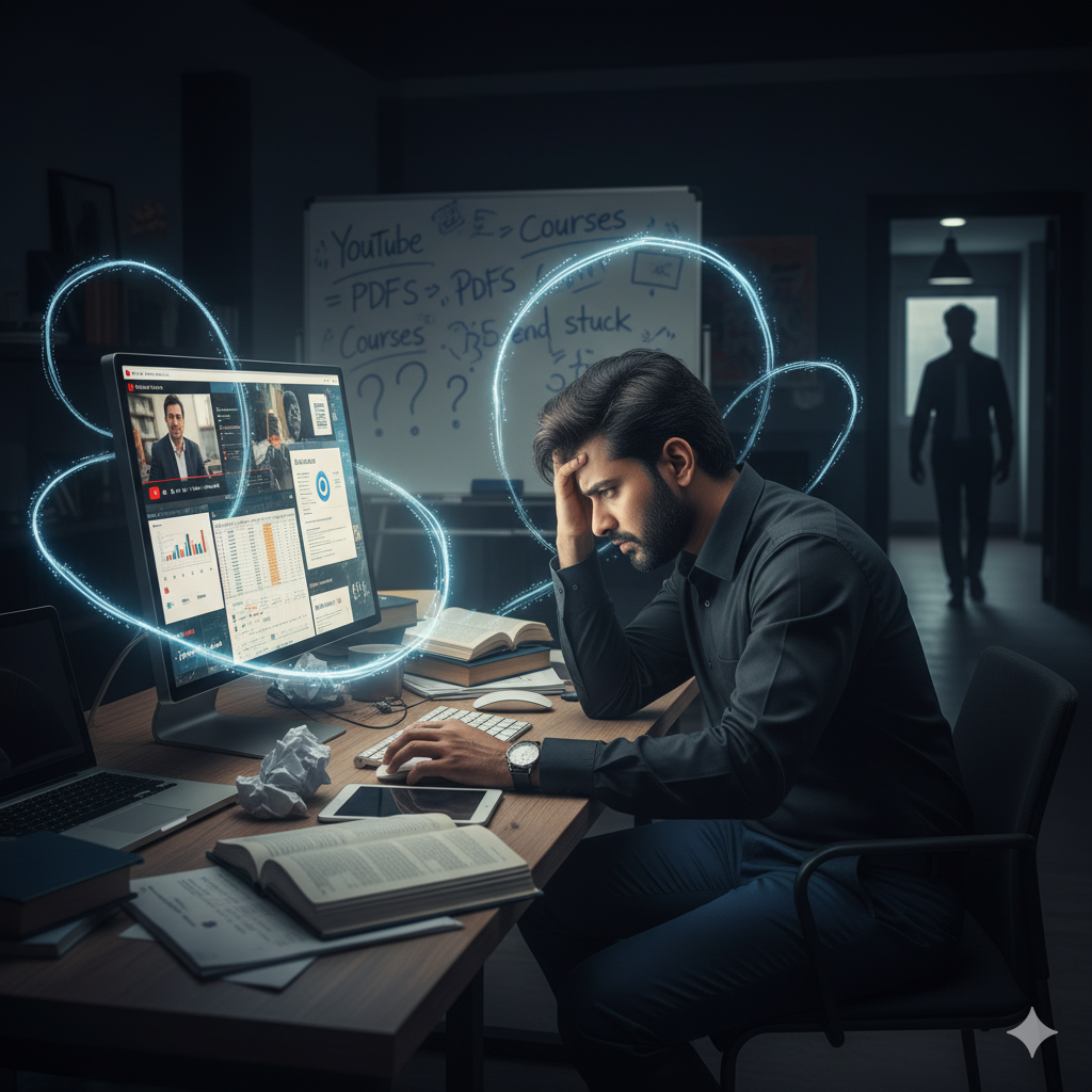 They jump between YouTube tutorials, PDFs, and online courses. However, they never reach the point where the skills feel real or usable.